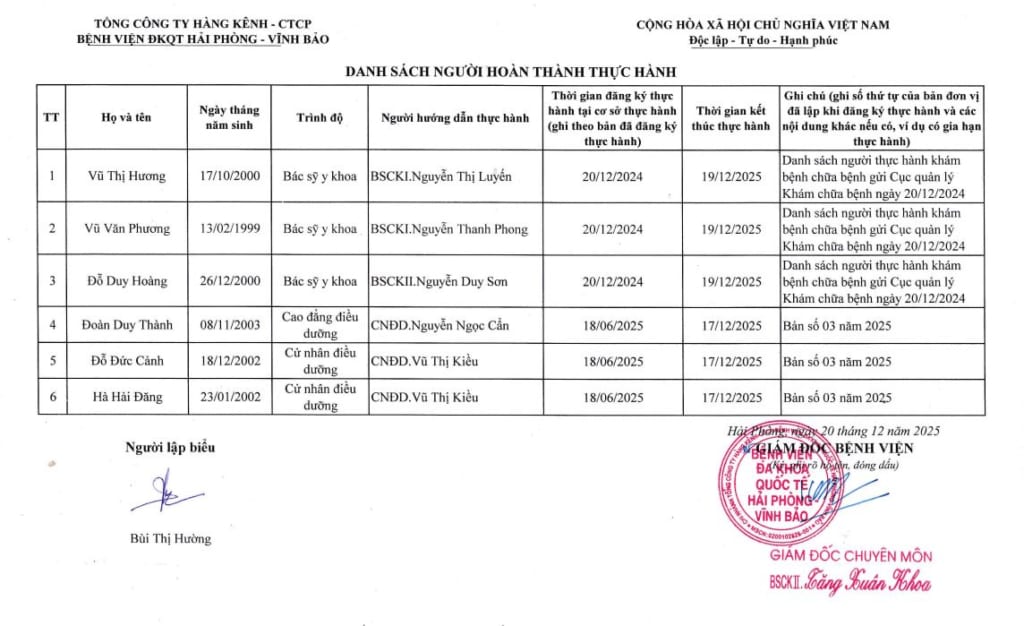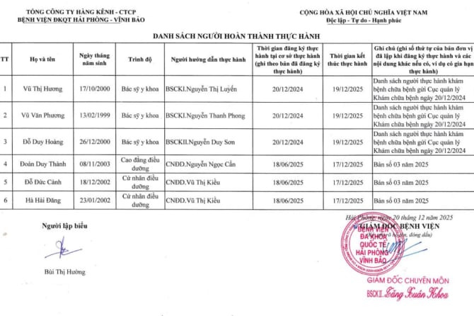 Danh sách người hoàn thành thực hành tháng 12.2025 (6 nhân sự Vũ Thị Hương, Vũ Văn Phương, Đỗ Duy Hoàng, Đoàn Duy Thành, Đỗ Đức Cảnh, Hà Hải Đăng)
